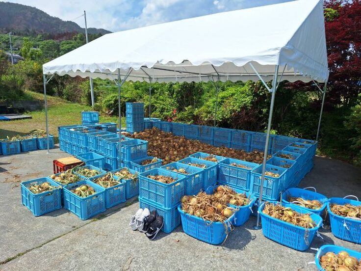 赤崎町外口地域で生産される玉ねぎは”潮風玉ねぎ”とも称され、知る人ぞ知る地元で愛されている玉ねぎです。6月の収穫を無事に終え、お贈りしたテントを活用いただいて出荷前の保管を行いました。地域で愛される玉ねぎが、収穫をあきらめることなく今年も無事に食卓に届けることができました。