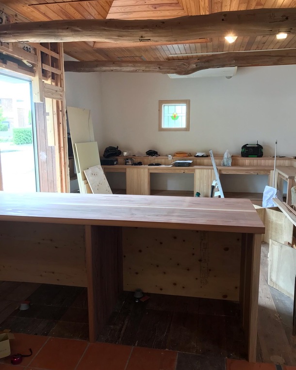 4月15日現在の店舗の様子です。商品棚やカウンターが形になって来たことによりだいぶお店っぽくなって来ました。