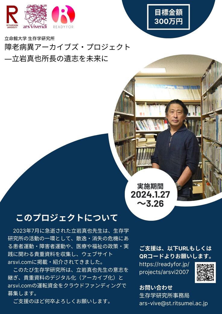 毎日新聞の紹介記事「立岩さんの意志、引き継ぐ 生存学の“声”アーカイブ化 立命大研究所がCF」(3月20日大阪版)とあわせて、お知り合いの皆さまにぜひご共有いただき、ご賛同・ご寄附をいただければ幸いに思います。