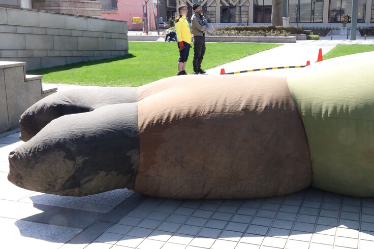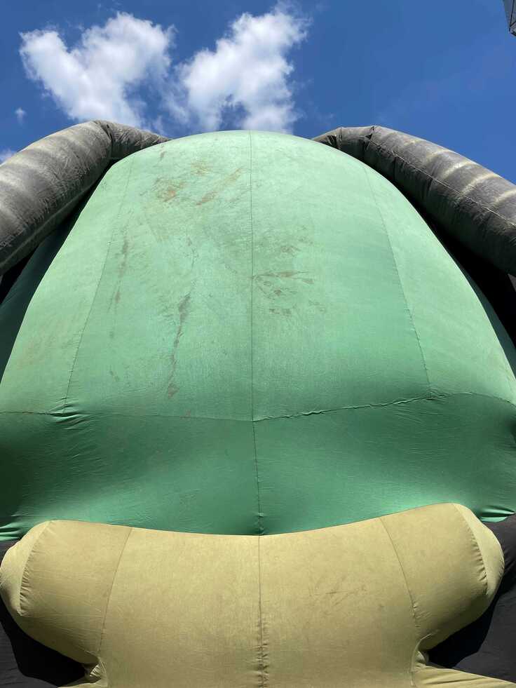 そして、本作の脅威は風です。空気で膨らませる巨大作品であるがゆえに、風に大いに引っ張られ、固定箇所の消耗や損傷を招きます。結果、胴体内部の強度が弱まるなどの経年劣化が生じ、2014年を最後に公開を控えていました。