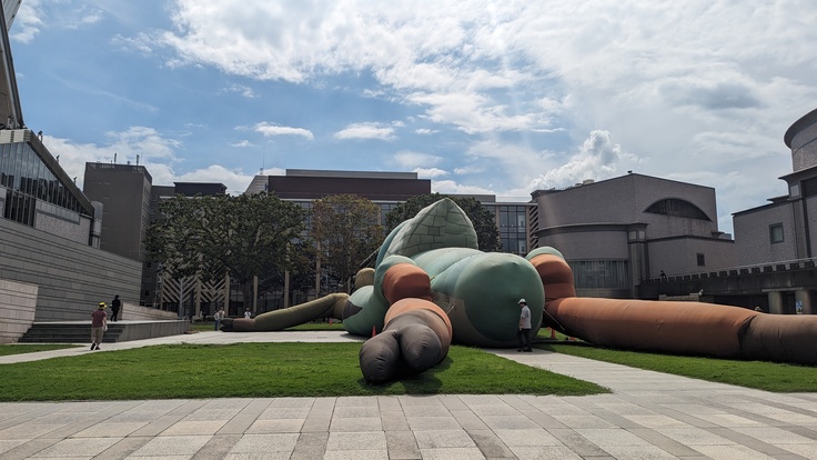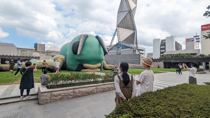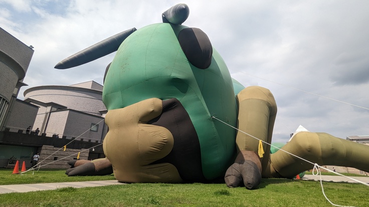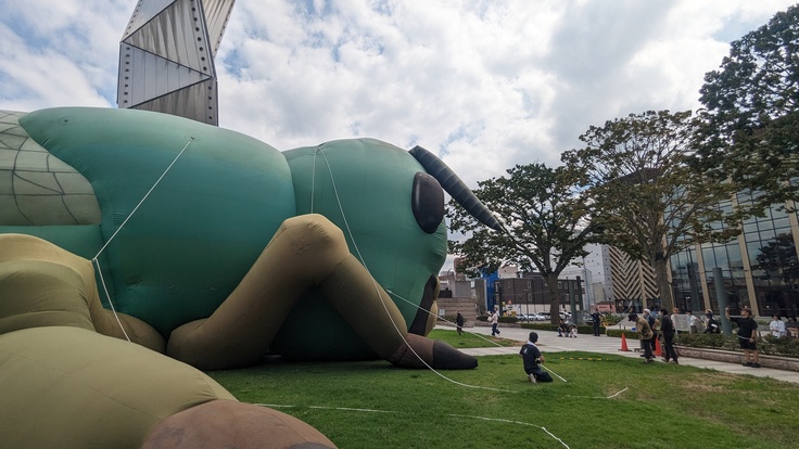 午前のうちにミシンを使っての触角の縫合作業は完了し、新しく取り付けられた触角は軽くなったことの証に、頭から垂れ下がりながらも風でふわふわと動きを見せた。(だが残念ながら、軽量化した新しい触角も重力に逆らって空に向かって立ち上がるには至らなかった。それだけ胴体内部の圧が低下しているというのがバルーン作品の製作のプロである修復業者の見立てである。そのため、次の修復作業には、触角を立たせるための新たな工程の追加を検討することが必要になった。)また、胴体内部はもともと左右からバンドで引っ張ることで形状を安定させる構造になっている。だが、これらも経年劣化で留め具が壊れて効かなくなっていたため、バンドの交換も予定通り行った。