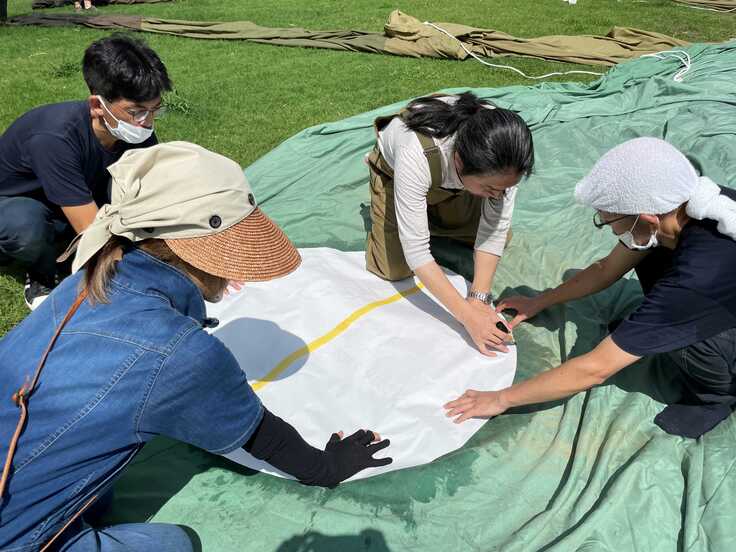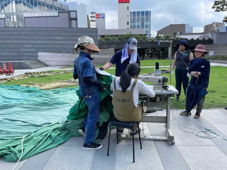 トークイベントが終わった14時40分頃、空の雲行きが怪しくなっていた。バッタを雨に濡らしてしまうと、よく乾かさなければカビが発生する。それでは修復プロジェクトが本末転倒だ。タイムテーブル通り、さっそく送風を中止し、しぼんだバッタの足先を修復業者が二手に分かれて取り外しに入った。左右の前肢のつま先が4本解けた時点で頭部側の胴体半分の折り畳み作業に入り、蛇状に細長く畳んだバッタをトラックの荷台に積み込んでいった。そして、後肢のつま先2本が完全に解け次第、残り半分を折り畳んでトラックに積み込むという臨機応変な連携プレーが指揮された。途中一時的にぽつぽつと雨を感じる瞬間があったが、なんとかバッタを濡らすことなく積込みを完了した。バッタ復活ボランティアのみなさんの協力のおかげで、予定より1時間早く16時頃、広場での作業は終了した。