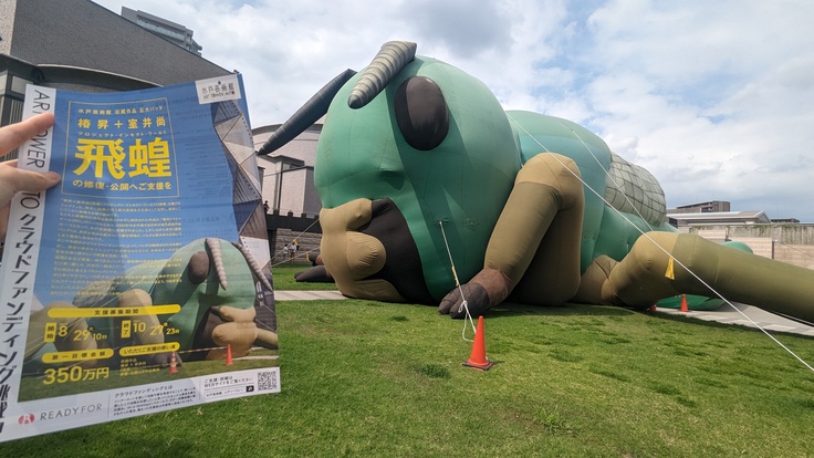 終わってみると、現場がスムーズに運んだのはよかったが、個人的には運営面のあれこれに気が取られすぎて、見に来てくださった方々の様子をうかがう余裕がなかった。そのことがとにかく悔やまれる。だが、事故や怪我なく無事終了したことを慰めとしよう。次の公開にはもう少し余裕をもってあたりたいし、楽しみにしてくださっていた人たちがバッタを見られる時間をもっと確保したい。ただ、天候とにらめっこする星に生まれきたバッタだけに、公開の日程や時間が予定どおりになるとは限らない。まさにナマモノを扱うようなものだ。この特異な現代美術作品を守りながら親しみ、受け継いでいくこと——そのために、クラウドファンディングを成功させなければ! しばらくはそのための奔走がつづく。