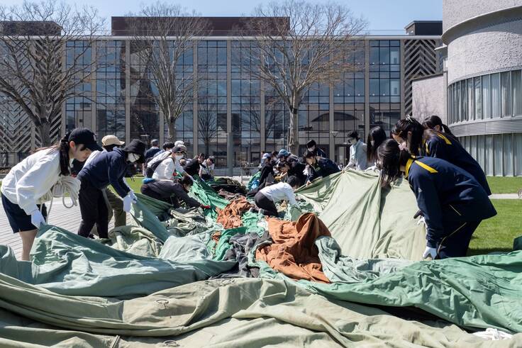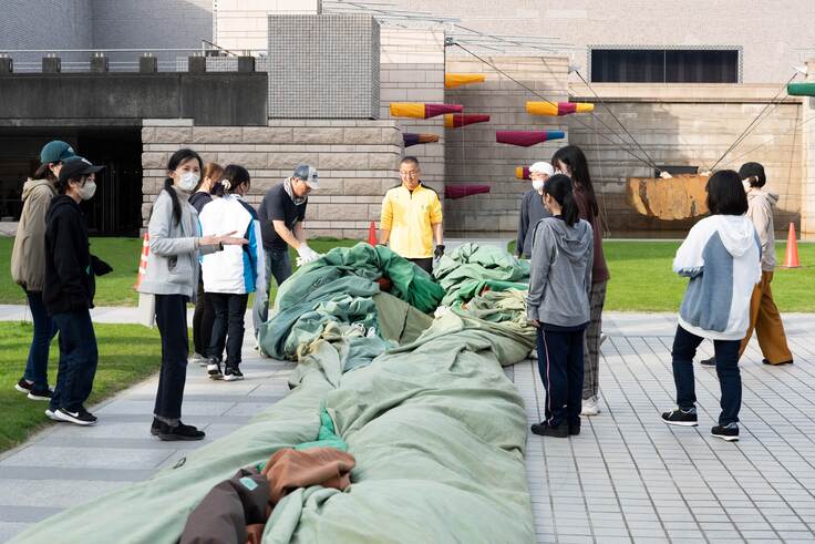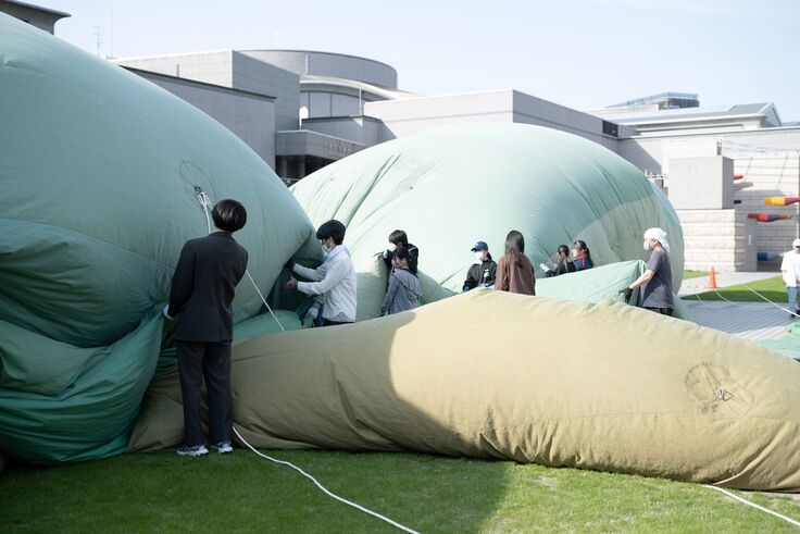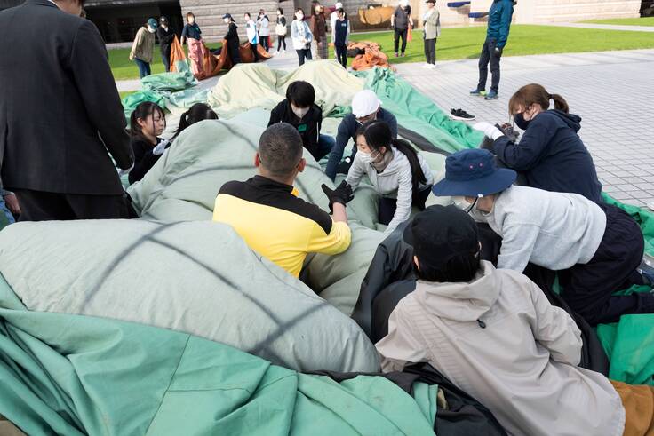送風機をストップし、ボランティアとスタッフみんなで協力して、バッタの内部から開口部へ空気を送り出すようにして抜き、バッタをたたみ込みます。