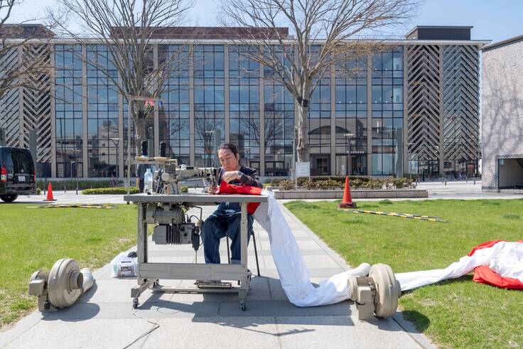 1日目は、昨年9月の時点で修復に向けて取り外した足先6本を、バルーン制作業者による再制作を経て新調し、本体に縫合する作業に専念します。