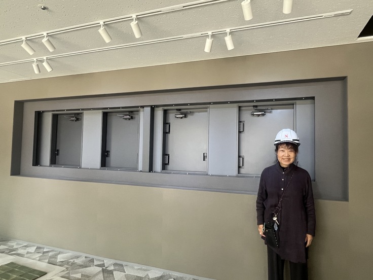 (スタッフ撮影:パロマ瑞穂スタジアムのVIPルーム壁面に設置された枠の前で、作品完成を想像して微笑む郡和子)