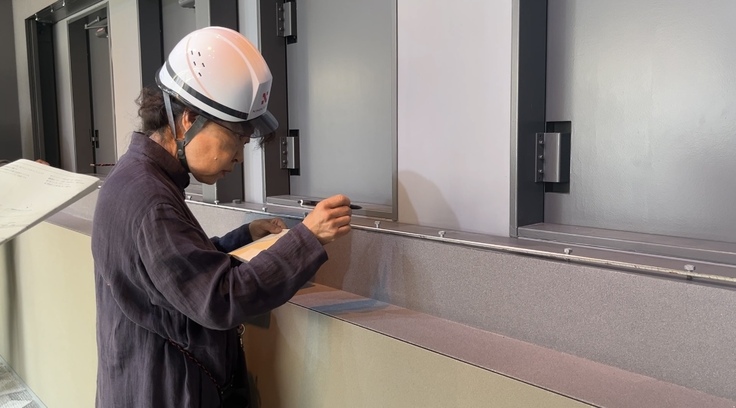 (スタッフ撮影:寸分たりとも狂いの許されない中、作品制作・設置のため、現場で入念に設置枠内の寸法を細かく計測し、メモを取りながら確認する郡和子)