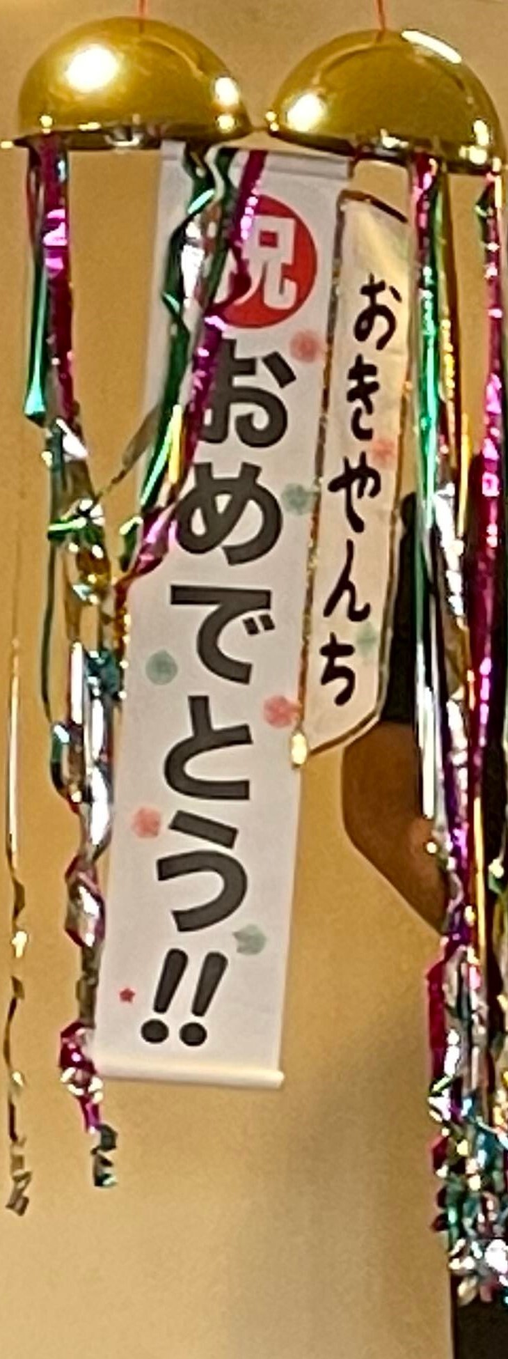 お祝いに駆け付けたおきやんの孫も急遽貼るお手伝い。