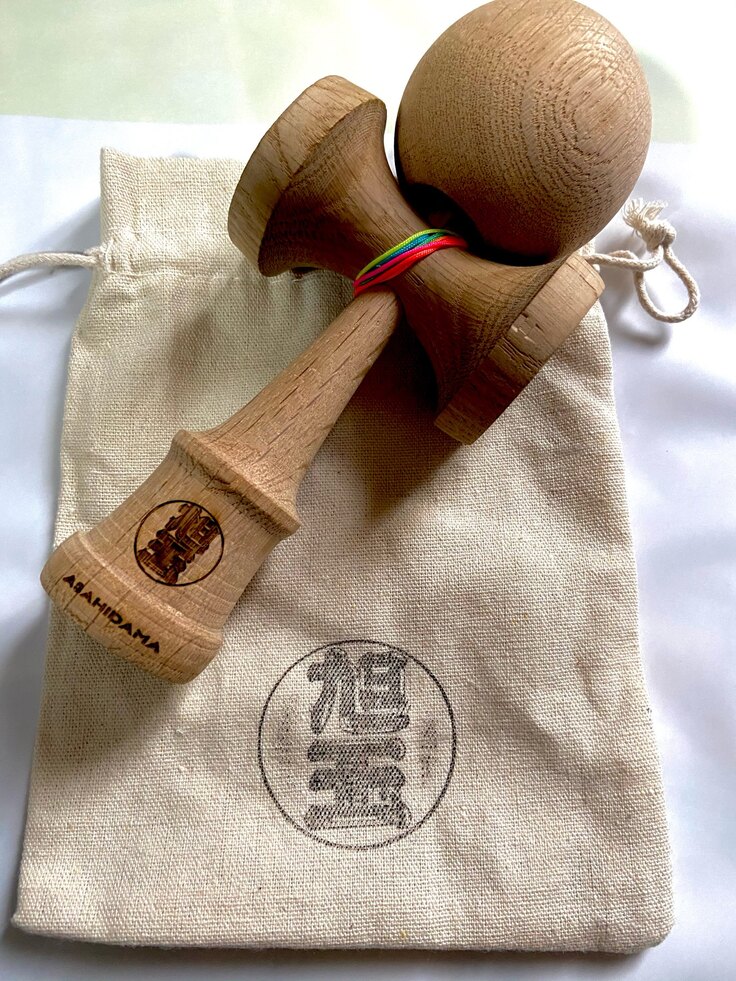 メイドイン旭川けん玉シリーズは基本「旭玉」ロゴが入る。祭り半纏のイメージにて、活気のある活気のある、迫力の漢字で表現した。赤玉はけん玉の基本、旭川の旭、朝日、日が昇るもかけて。