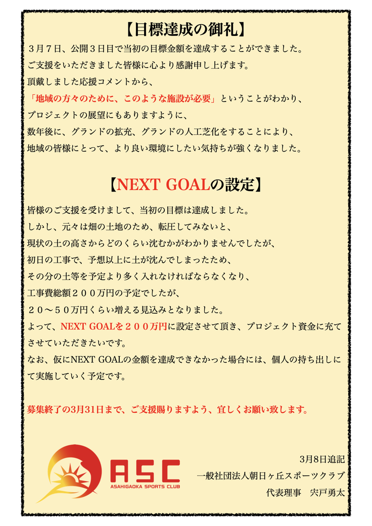 一般社団法人朝日ケ丘スポーツクラブが、自前のグランドを建設するための資金となります。 大きくは2つの作業となります。 ①整地 畑の土地にて、転圧を何度か繰り返し地盤を固め、その上に砕石を敷き、グランド用の土を入れて整地して、スポーツができる環境とする。 ②防球ネット 単管パイプとネットにて、グランドの四方を取り囲むように、防球ネットを作る。 ③トイレ 仮設トイレを設置する。