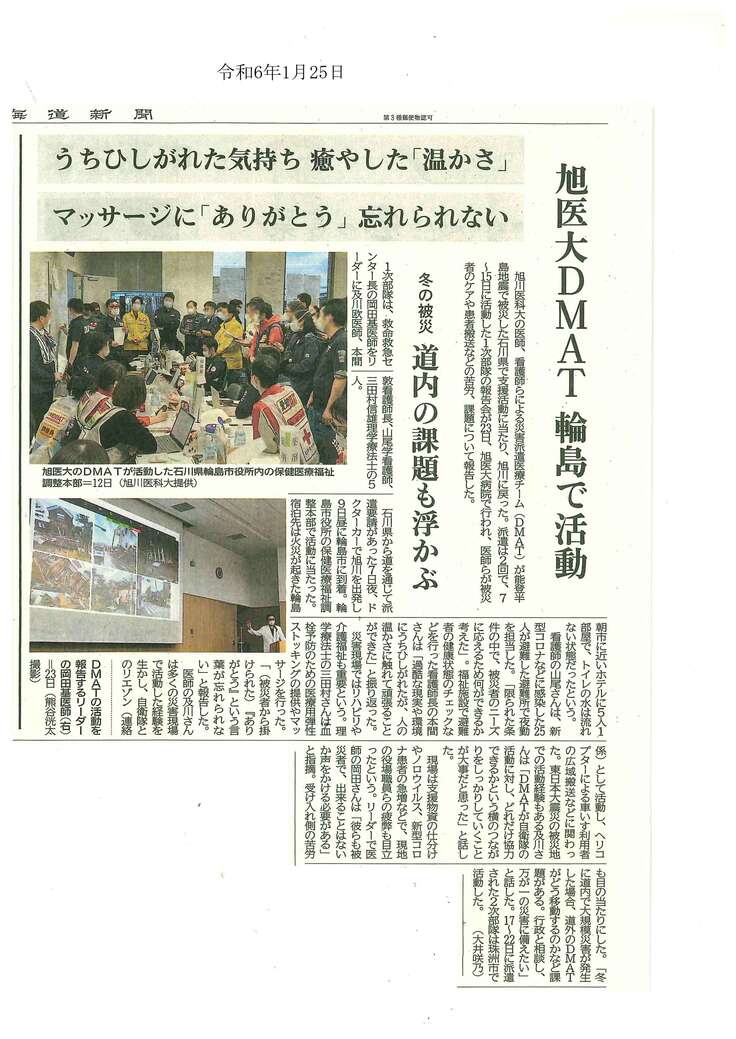 ※北海道新聞 2024/1/25付記事【旭川医大DMAT輪島で活動】