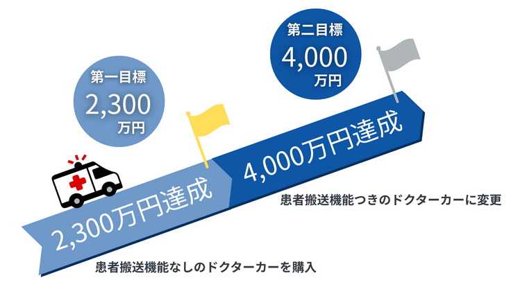 目標金額以上が集まった際には患者搬送機能がついたドクターカーの購入を目指します。