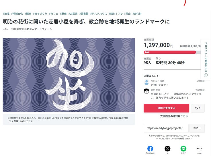 旧キリスト教会の建物をリノベーションして、岡山市街の限界集落に文化交流施設の西中島まちラボ「旭坐」を創設するためのクラウドファンディングの締切7月20日まで、後2日となりました。先月6月3日にスタートして以来、これまでに95人の多くの方々にご支援をいただき、すべての方々に厚く御礼を申し上げます。開始前に内心「100人支援が目標」と願っていました。金額はそれに相応しい成果が出るだろうと楽観しておりました。そこで、目標の100人達成まで後5人ですが、達成100人目の方への御礼として、弊クラウドファンディングが成立しましたら、オープニング事業の全てにご招待をさせていただきます。