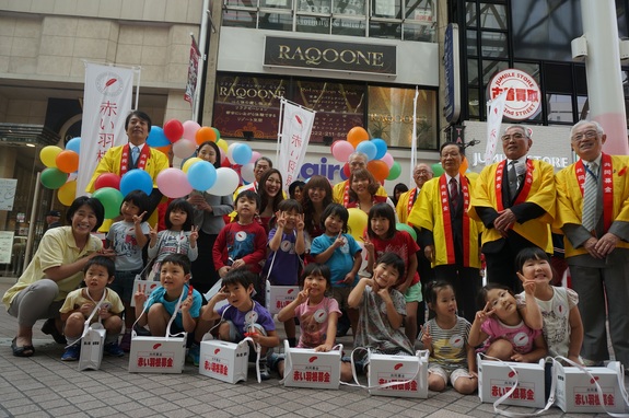 本日、保育園のそらのこ組(年長・年中児)は、「赤い羽根共同募金」の進発式に参加してきました。