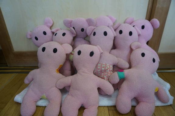朝市センター保育園には手作りのピンクのくまちゃんが12体あります。