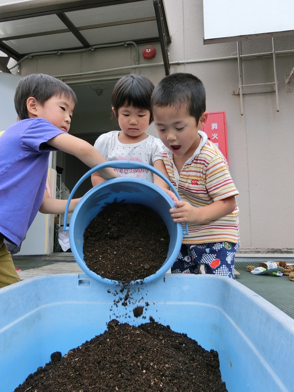 今、屋上は、やまのこ組(3歳児)の「土嚢袋さつまいも」を残すのみとなりましたが、土の中から少し実が見えるだけでも大興奮して、収穫の時を今か今かと、楽しみに待っている子どもたちなのでした。
