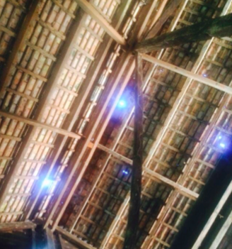 (穴が開いてボロボロの屋根。曲がった柱。子供達は危険に晒されています)