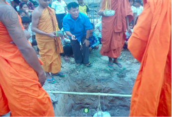 この写真は、校長先生をはじめお坊さん、村人及び学生たちが集まり、着工式を行なっている様子です。自分たちの村に日本人の支援のおかげで校舎ができると、多くの人が集まりました。