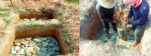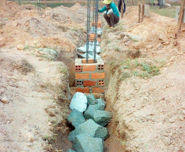 柱の足を繋げていきます。真っ直ぐ上に伸びているか、平行になっているかを慎重に確認しながら作業が進められます。 そして土は柔らかくて弱いので土台は石を並べ、更にセメントを流して上部な土台を作っていきます。 |