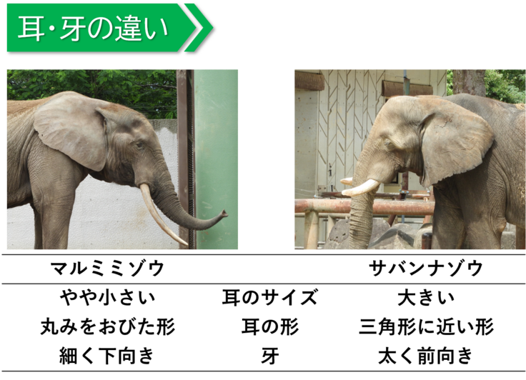他にも、サバンナゾウは一般的に爪の数が前肢4つ、後肢3つですが、マルミミゾウは前肢が5つ、後肢が4つと1つずつ多いです。ただし、これには個体差もあり、爪の数だけでは見分けることができないともいわれてます。