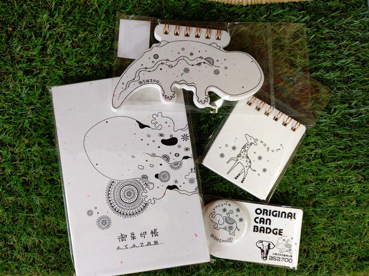 かめいち堂さんのイラストは、安佐動物公園で販売しているおりづる再生紙を利用したメモ帳や御朱印帳、オリジナル缶バッジに使われています。