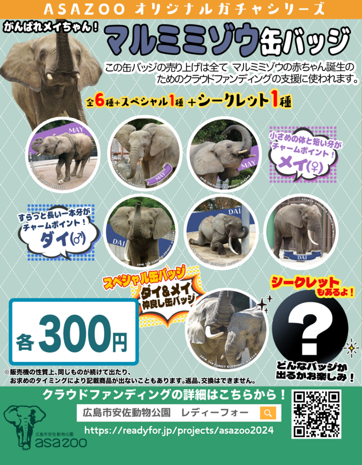 「マルミミゾウの赤ちゃん誕生をみんなで支えよう!」プロジェクトに合わせて、安佐動物公園の園内で「がんばれメイちゃん! マルミミゾウ缶バッチ」ガチャの販売を開始しました。