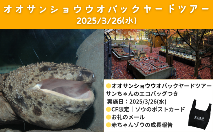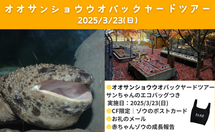 上の文章でも紹介した非公開の屋外施設「オオサンショウウオ保護増殖施設」のバックヤードガイドツアーをリターン品として新たに追加しました。お日にち違いで、2コースございます。