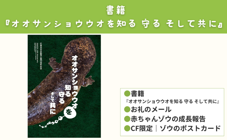 安佐動物公園開園50周年を記念して2021年に発刊した、 オオサンショウウオに関する安佐動物公園での研究や保全活動等をまとめた書籍『オオサンショウウオを知る 守る そして共に』 をリターン品として新たに追加しました。