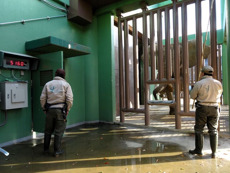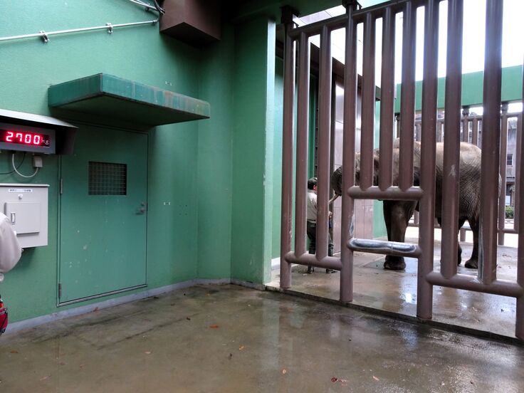 メイを飼育しているゾウ舎には、現在は正確に体重を測定できる機器がありません。そのためダイに部屋に入ってもらってから、メイをマルミミゾウ舎側に連れて行って体重測定をしています。この時は2700kgでした。