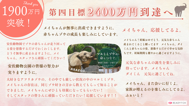 広島市安佐動物公園のクラウドファンディングプロジェクト「マルミミゾウの赤ちゃん誕生をみんなで支えよう!」プロジェクトに多くの皆様からのご支援、応援をいただきありがとうございます。