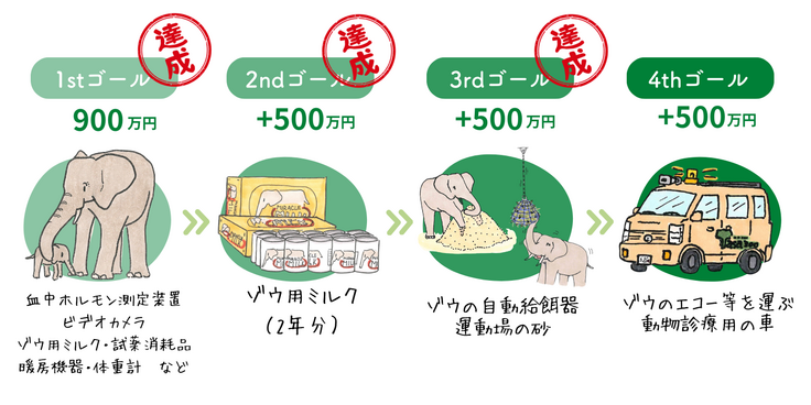 第4目標では、ゾウの妊娠検診や人工哺育、園内の他の動物の健康管理を行うための動物診療車を目標に、2,400万円を掲げて挑戦を続けてまいります。