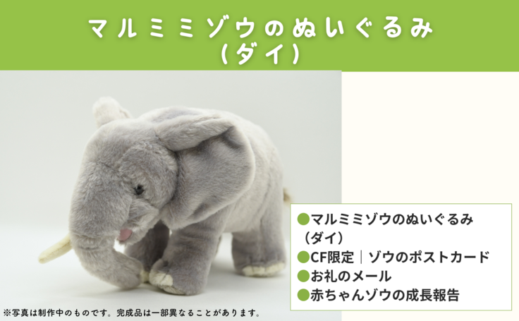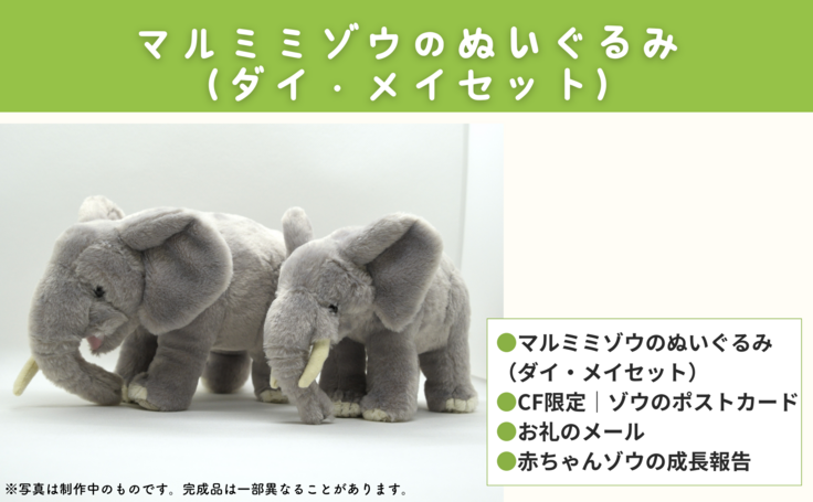 今回、ゾウ担当監修のこだわりのぬいぐるみ(マルミミゾウのメイとダイ)をリターン品として追加しましたのでご紹介させていただきます。