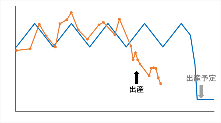今回実際に測定した血中プロジェステロンの変化と、想定していた出産時の変化のグラフを紹介します。