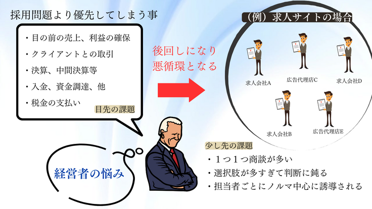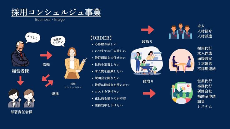 そして新たに立ち上げた「採用コンシェルジュサービス」は、特に小規模の企業が直面する採用課題に対する解決策として誕生しました。忙しい日常業務に追われながら、採用問題に十分な時間を割くことができない経営者や事業担当者に向けて、このサービスは設計されています。