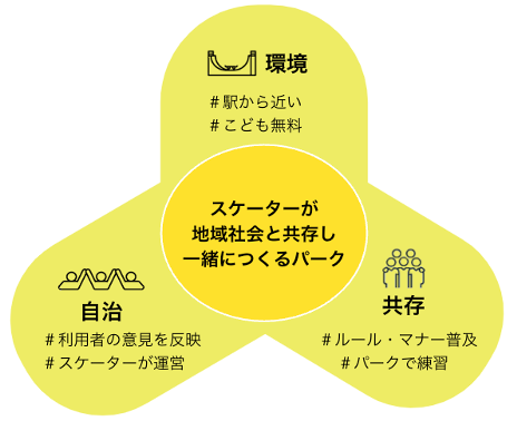 私たちは「スケートボードをする人もしない人も暮らしやすいまち」の実現に向けて、