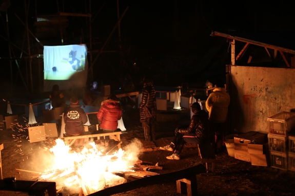 映画を見ながら大笑いする子もいれば、小屋の中でカードゲームをしている子もいたり、大人は焚き火を囲んでお喋りしながらまったりしていました。