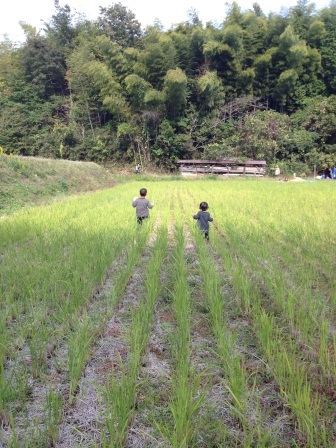(田んぼの中を思いっきり駆け回ってあそぶこどもたち。)