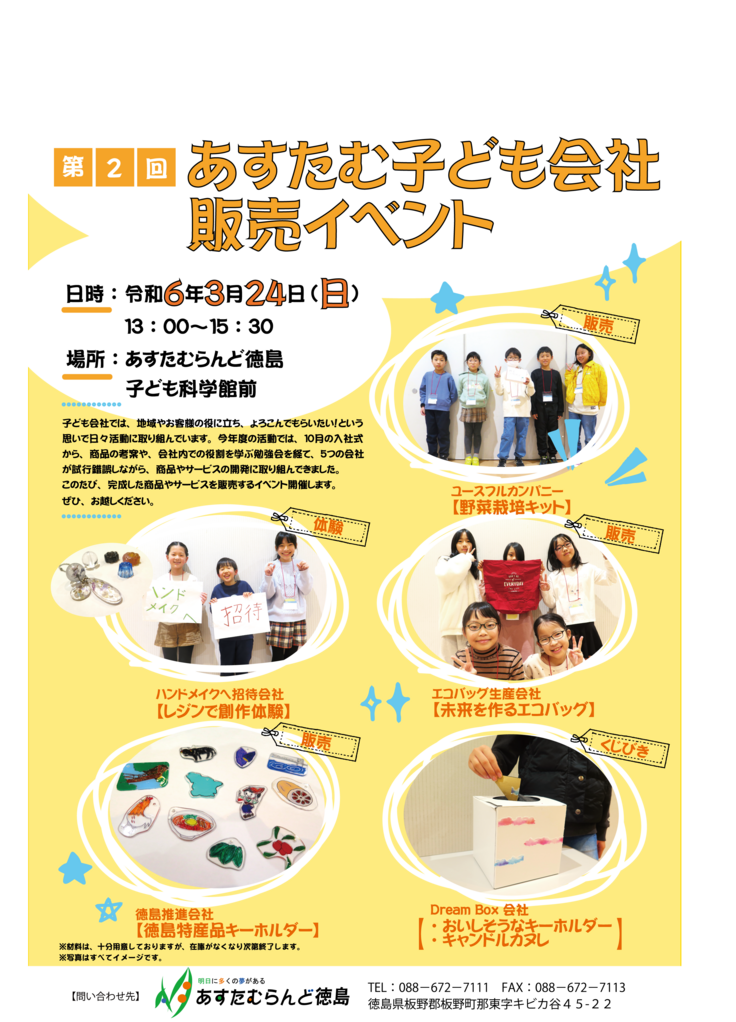 10月の入社式から、活動を続けてきた集大成として、子ども社員たちが、5つの会社でそれぞれ思いを込めて作った商品(サービス)を販売します。ぜひ、ご来場ください。