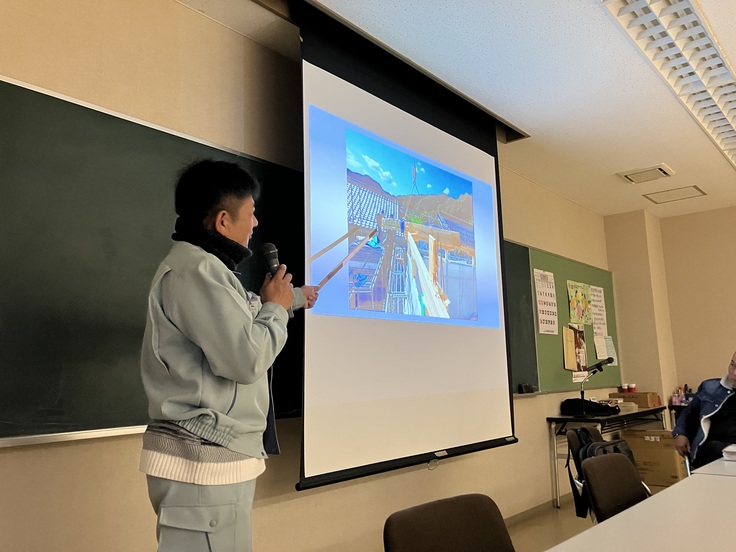 選定された事業者は、福知山市の隣の綾部市にある(株)匠工務店さんで、その吉崎代表取締役より設計図の説明がありました。その後、プロジェクターを使って会社の紹介やこれまでの実績、上棟式の様子を映した動画などの紹介がありました。その中で強調されたのは、神社の建築は一般の大工工事とはまったく異なり、構造上の違いだけでなく道具、釘1本の打ち方まで変わってくるとの事でした。
