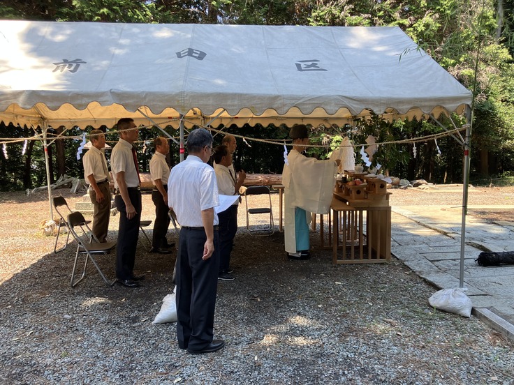 本日は、令和7年度愛宕神社夏の大祭の神事が宮司のもと執り行われました。前々日から日本一の最高気温を記録した福知山でしたが今日も朝からじりじりと夏の強い日差しが照りつける中で厳粛に執り行われました。宮司からは、火事や災難が起こらないようにと共に一刻も早く焼失した社殿が再建されるようにとの願いもこめて神事を執り行ったのお話もありました。神社総代代表や土師、前田両地区自治会長、再建委員長が代表して玉串奉奠をしました。参加者一同再建へ動きを一層加速させていこうとの思いを強くしました。これからも再建に向けた取り組みをお伝えしていきます。最後までお読みいただきありがとうございます。