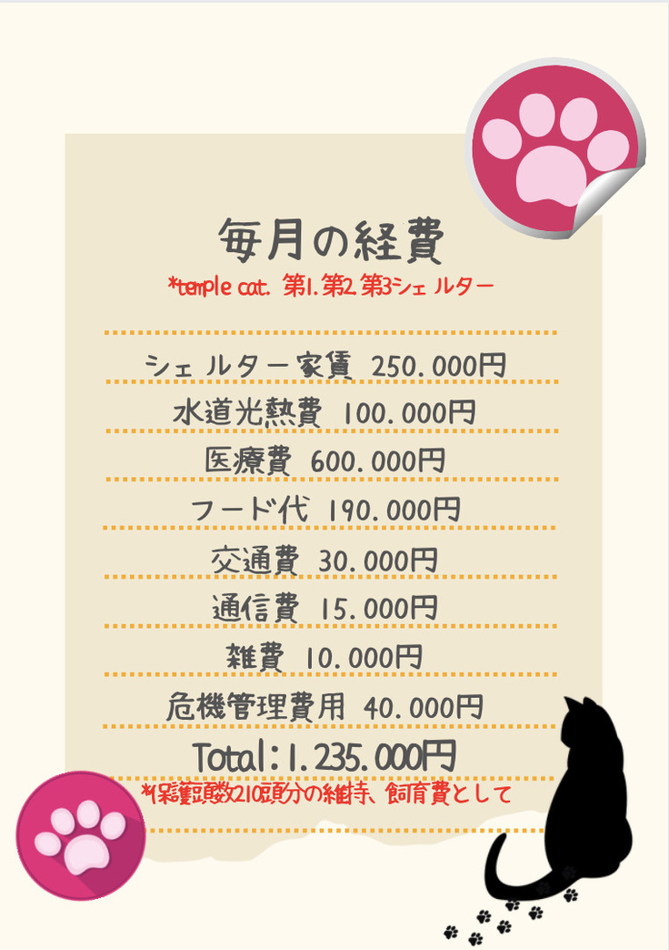 これまでくすのきの運営費用は、〝ねこざんまい譲渡会”でいただく『譲渡費』と皆様からお預かりした『ご寄附』で賄って参りました。