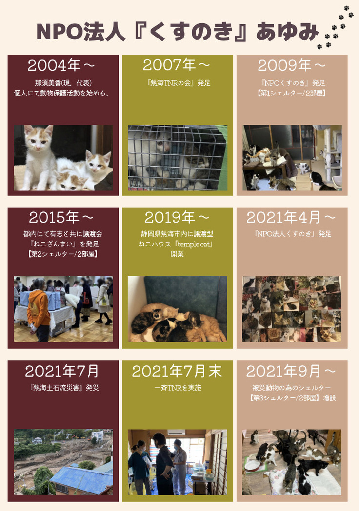 昨今の新型コロナウイルス感染症拡大や熱海での災害などにより、くすのきと保護ネコ達を取り巻く環境は年々厳しさを増しております…一頭でも多くの命を救う為、くすのきはクラウドファンディングによる継続支援を通し少しでも多くの皆様に『もの言えぬ小さな命』の過酷な現状を知っていただき応援をして頂けましたら幸いに存じます。
