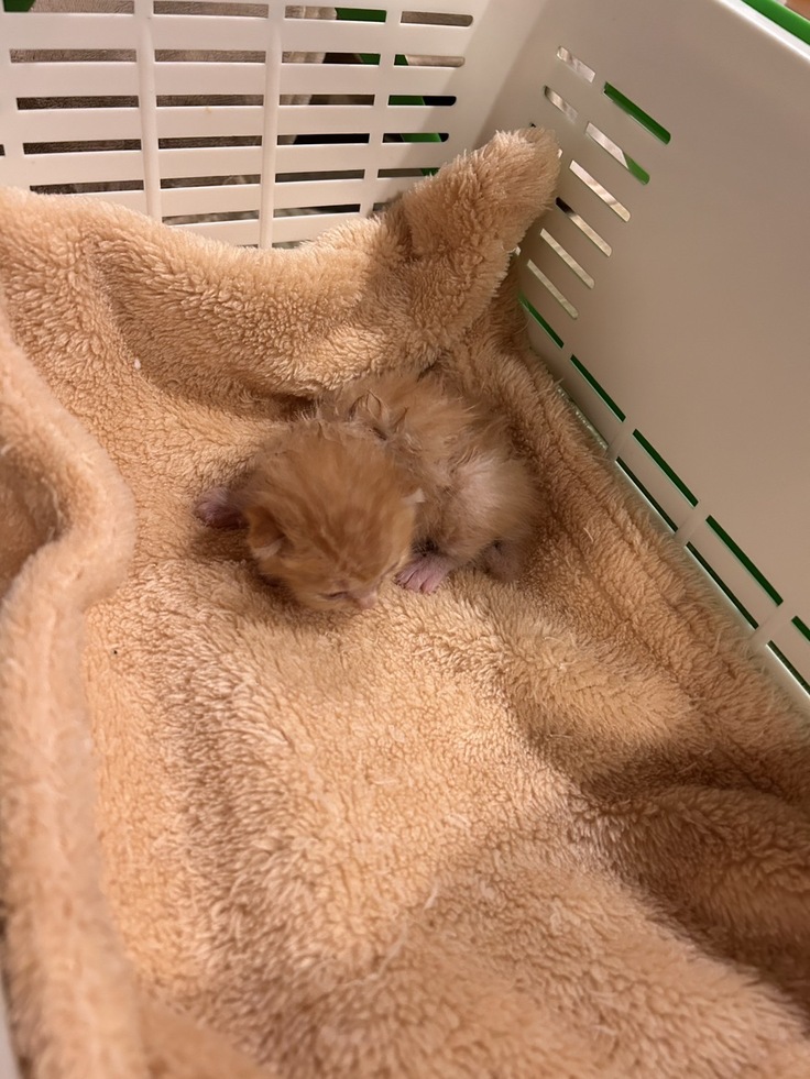 低体温になっている様子から、母猫が運んでいる途中に落としてしまったのか、何処かで産まれているのが人間に見つかり遺棄されたのか解りませんが、命が危険な状態でした。