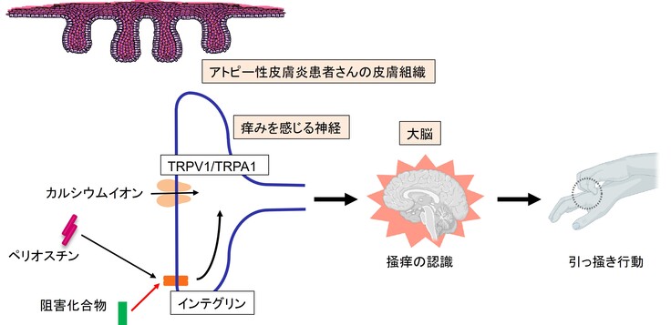 では、アトピー性皮膚炎で痒みが引き起こされるのはなぜでしょう。アトピー性皮膚炎が起きている皮膚では、さまざまな炎症物質が作られます。それらの炎症物質の中に、痒みを伝える神経を刺激して、TRPA1やTRPV1を活性化するものが存在します。それが痒みの原因物質となります。ここ数年、その痒みの原因物質を探す研究が世界的に激しい競争で行われおり、これまでに、いくつかの痒みの原因物質が見つかっています。その中で、私達は、炎症物質の一つである「ペリオスチン」もその一つであることを見つけました。