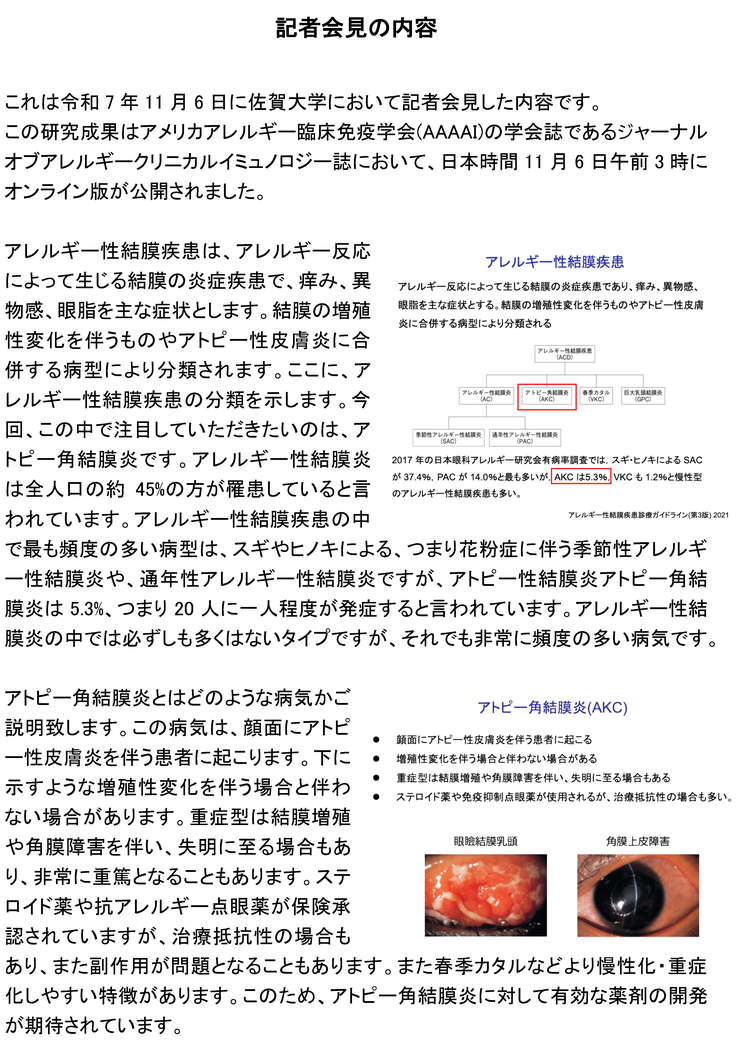 慢性のアレルギー性結膜炎に対する治療薬の開発を目指して、研究成果に関する記者会見を行いました
