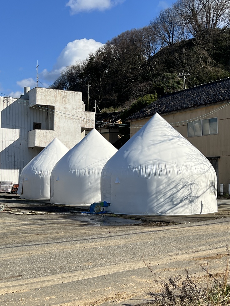 名古屋工業大学の北川教授が開発された、インスタントハウス(ホイップクリーム型)のハウス。このハウスを北川教授のご厚意で無償で3棟建てて頂きました。私達の朝市は撤去にも時間がかかる為にこのままでは、作品を制作する為に年単位でかかりそうな現状です。そこで、北川教授に直談判させて頂き、アトリエで利用したい旨をお話しし、ご承諾頂きました。この開発されたインスタントハウスは建物を造り上げる時間も短時間、3棟で約2日。そして耐久性も2年から10年程利用可能。風速80Mまで耐えうる建物です。空間は直径5M程あり、私達の制作には充分のスペースがあります。