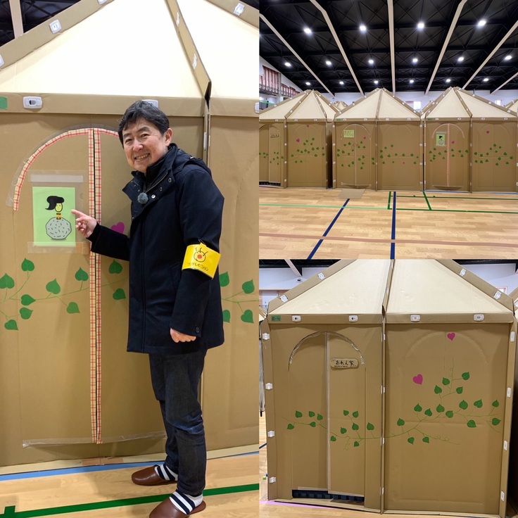 何時もの、優しいお喋りとお人柄で素敵な笠井アナ。久しぶりに穏やかなひと時でした。この、避難所のダンボールハウスの壁画は畠中が描きました。少し殺風景の壁面でしたので、ハートカズラを💚のびのび成長し優しさに溢れるそんな空間になって欲しいそんな願いから。