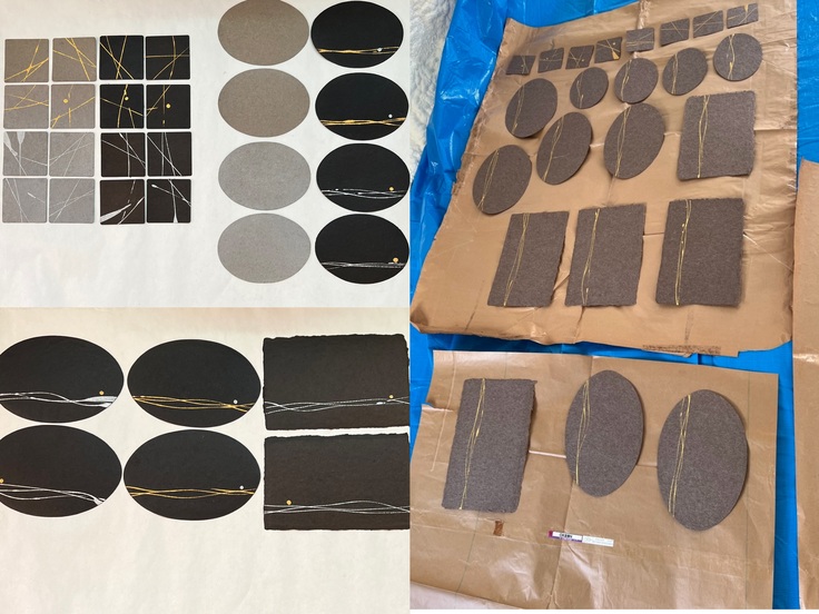 < 右は輪島仁行和紙にペイントまで、左は漆を塗った状態(左上コースター.左上tea.左下teaマツト楕円.teaマツト四角) >