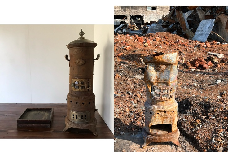 主人は、活動報告に載せてある通り現在も復興工房パオにて漆地紋様紙の制作に没頭しています。私は、130年の歴史のかけらを見つける為毎日、朝市の焼け跡に出かけています。先日も、瓦礫の山の中に大切な物を見つけました。ギャラリーにいらして頂いたお客様には見覚えのある古いストーブ「FUKI TOKYOのアンティークストーブ」