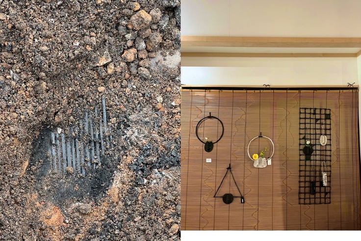 ギャラリーを入って左手前ガラス窓には、竹の簾。この簾も竹の節だけで、瓢箪と蔓を表現しています。細い竹で時間をかけて丁寧に作られた匠の技、此方も皆さん足を止めて長い時間眺めていました。若いお客様にも評判の竹の匠マジックでした。昨日、20cm程掘り起こした土の中から炭化した状態で出て参りました。